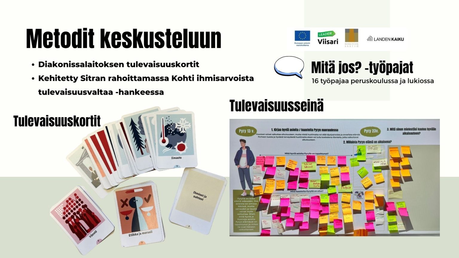 Mitä jos? -työpajat auttavat hahmottamaan vaihtoehtoisia tulevaisuuksia helposti lähestyttävällä tavalla. Koska tulevaisuudesta puhuminen voi olla monille vaikeaa, työpajoissa lähdetään liikkeelle kysymyksistä, jotka tarjoavat eri näkökulmia tuttuihin ongelmiin. Tämä auttaa osallistujia pohtimaan ratkaisuja ja hahmottamaan mahdollisia kehityssuuntia.